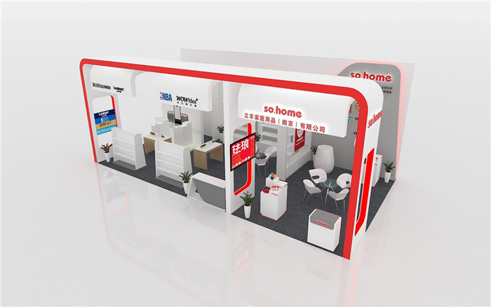 立丰的展览展位装修,以现代风格设计,主体以白色为主,红色点缀,体现出电子商务形象。