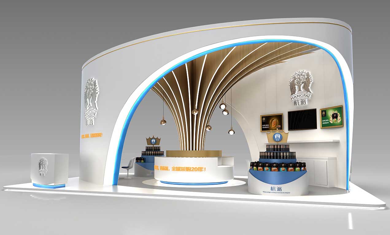 食品展会特装搭建中,杭派采用了“椭圆形”元素设计,半开放式的展台造型以白色为主,外加蓝色发光带装修,展示出了个性独特、时尚高端的品牌形象。