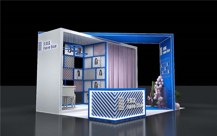 天真蓝本次的巡展活动展位设计搭建,开放式设计,以蓝色、灰色为主,根据客户需要设计了化妆区、拍摄区、活动区、接待区等。展台呈现了简洁、舒适的氛围。